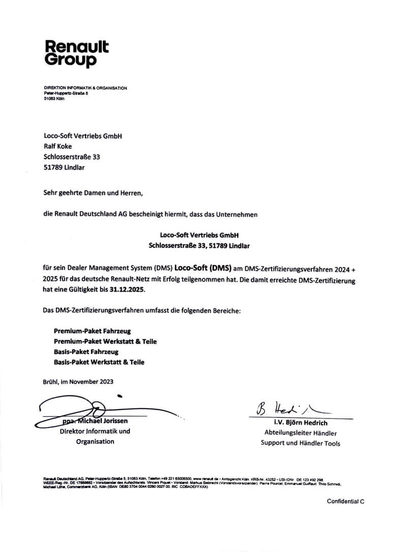 Loco-Soft wird von der Renault Deutschland AG als geeignetes DMS für seine Partner selektiert